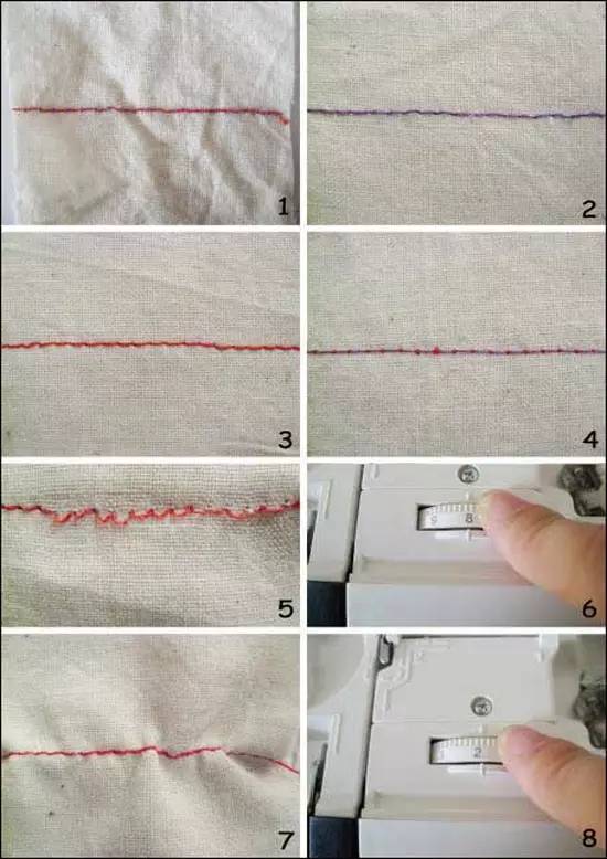 4)縫料皺縮:面、底線張力都過大,兩線的交合點處于縫料之間,但縫料產(chǎn)生皺縮(特別是薄料)和不平直,稍微用力一拉縫料,就會使縫線拉斷。解決方法:減小面線、底線的張力即可。(如圖7、8)